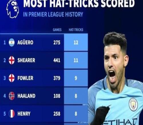 德转统计英超历史戴帽次数前10:阿圭罗12次第1,哈兰德第4