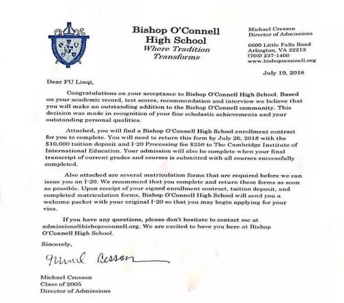 美国欧卡诺高中录取通知书